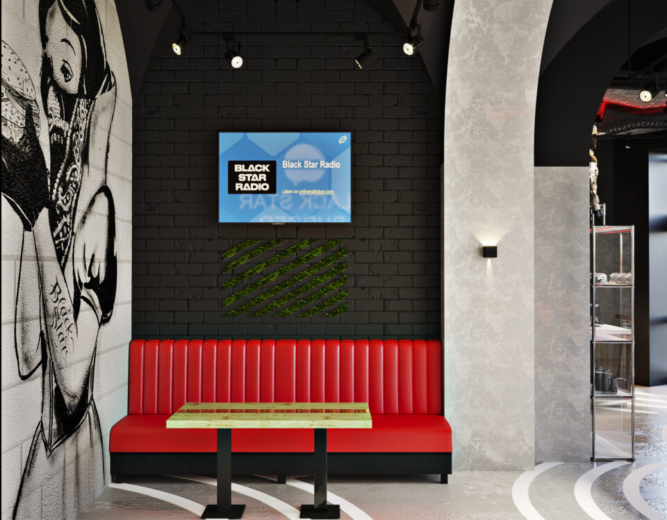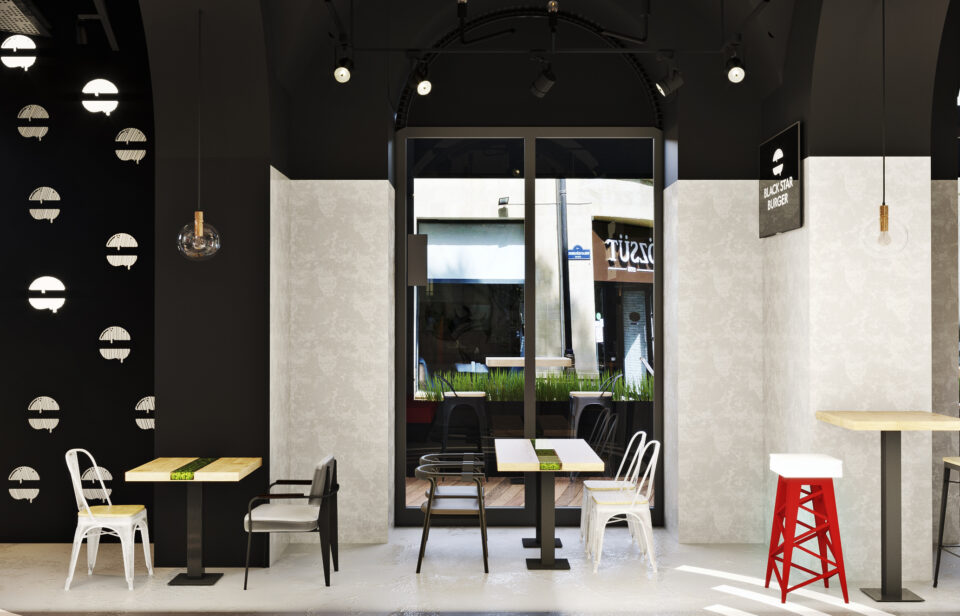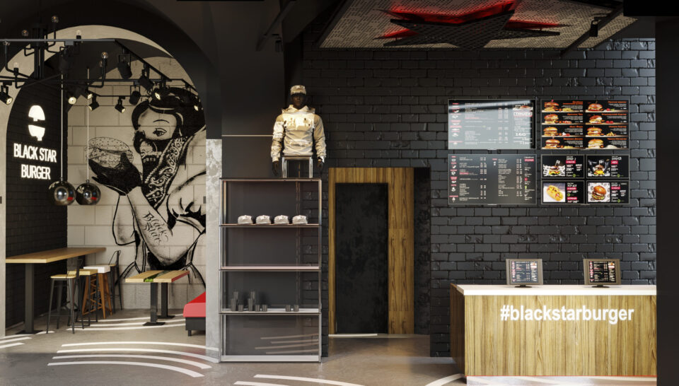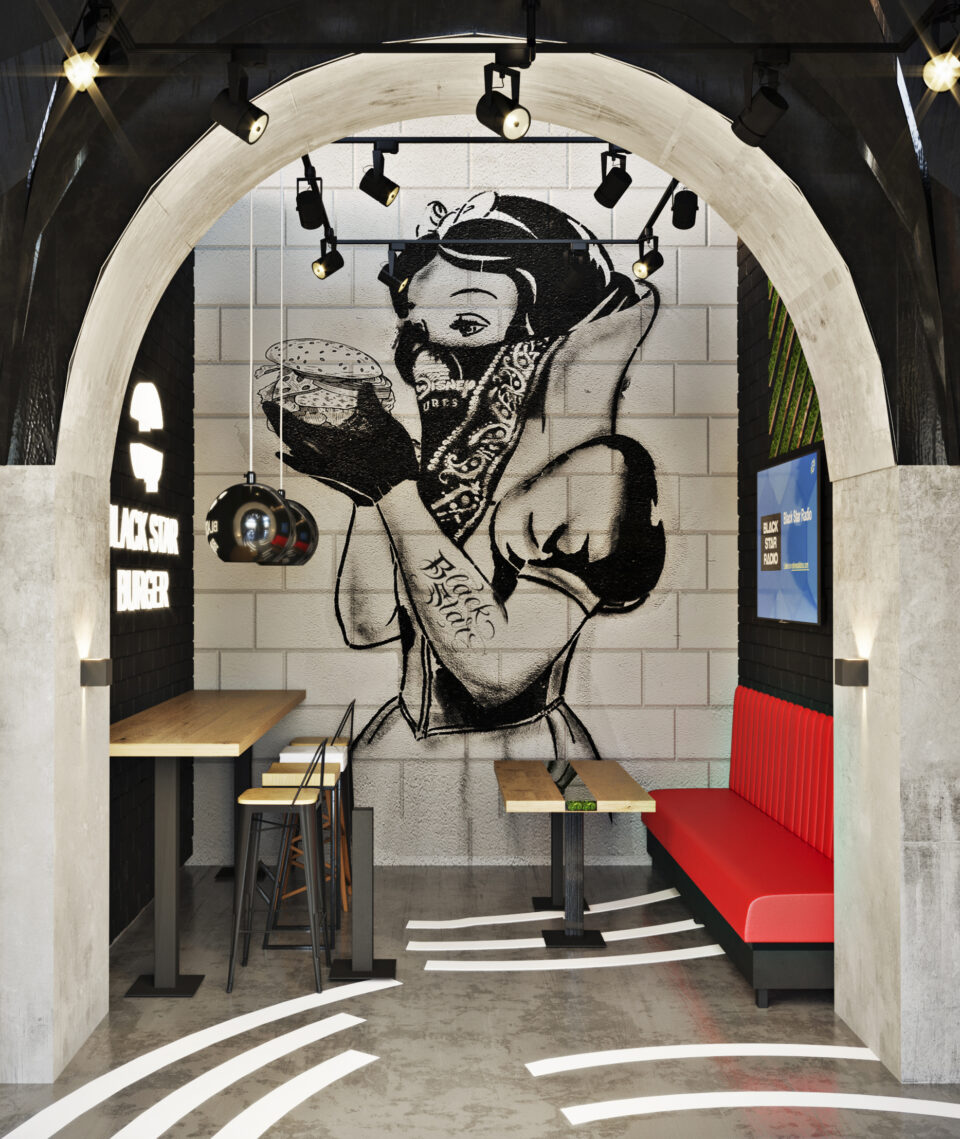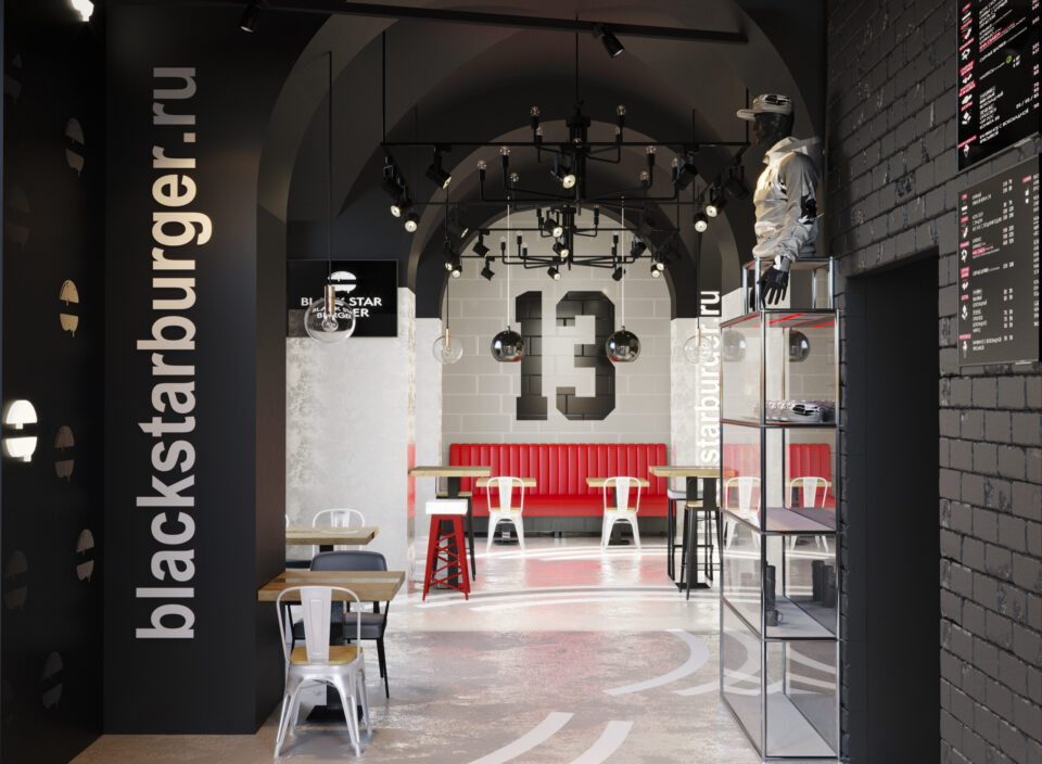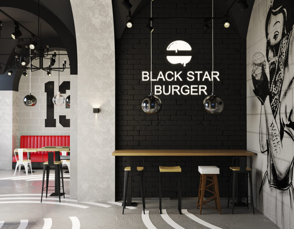 Представляем вашему вниманию проект Бургерная от репера Тимати.Это третий наш проект ресторана Black Star Burger.В процессе создания дизайна,были учтены не только стилевое решение интерьера ,но и все технические требования проекта.Решение функциональных задач интерьера,безопасность и экологичность,эстетика и психологический комфорт.Интерьер выполнен в стиле лофт.